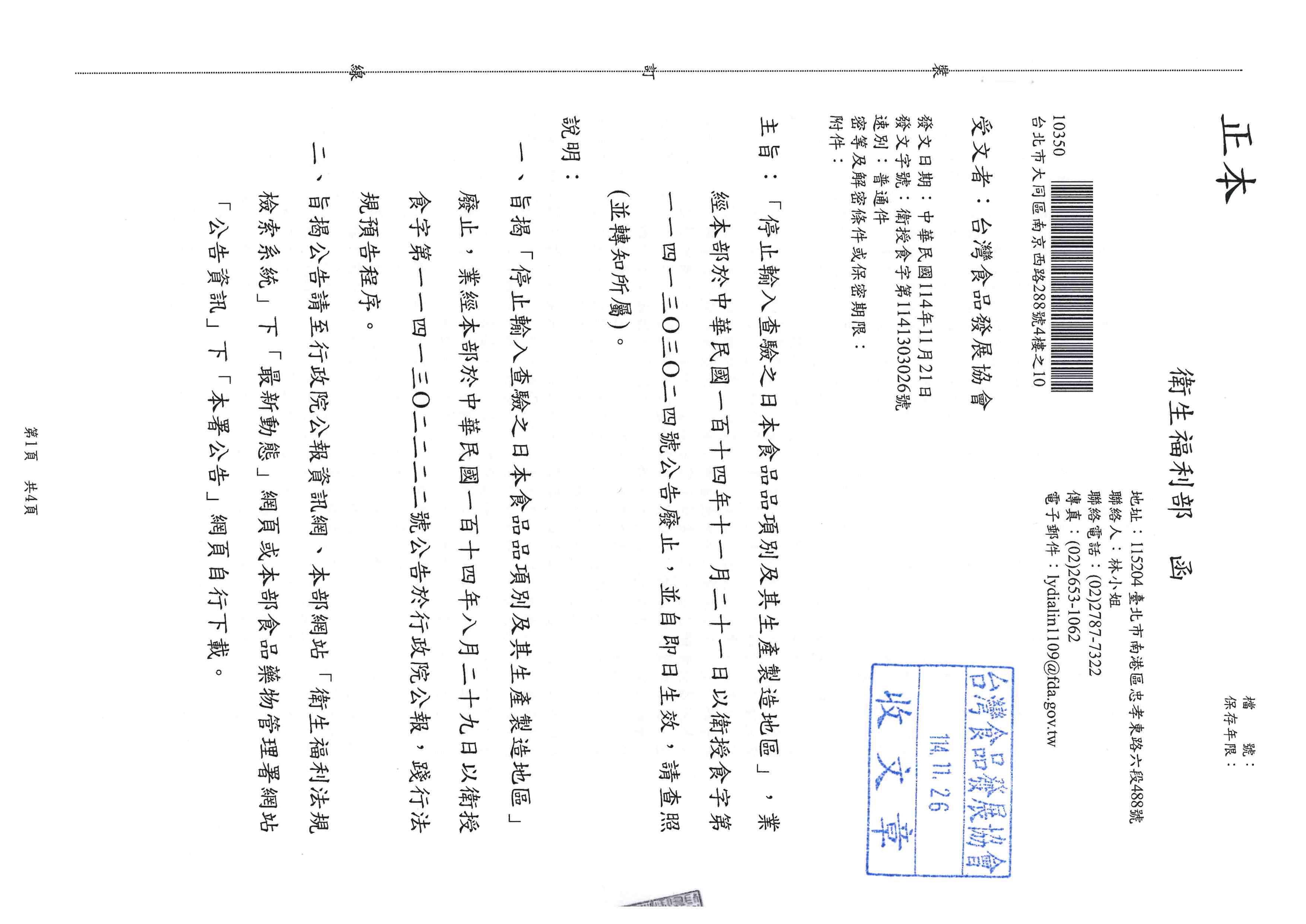 發佈日期:2025-11-26 「停止輸入查驗之日本食品品項別及其生產製造地區」,業經本部於中華民國114年11月21日以衛授食字第1141303024號公告廢止,並自即日生效,請查照(並轉知所屬)。 詳附件 檔案下載區 衛授食字第1141303026號 下載 回上一頁