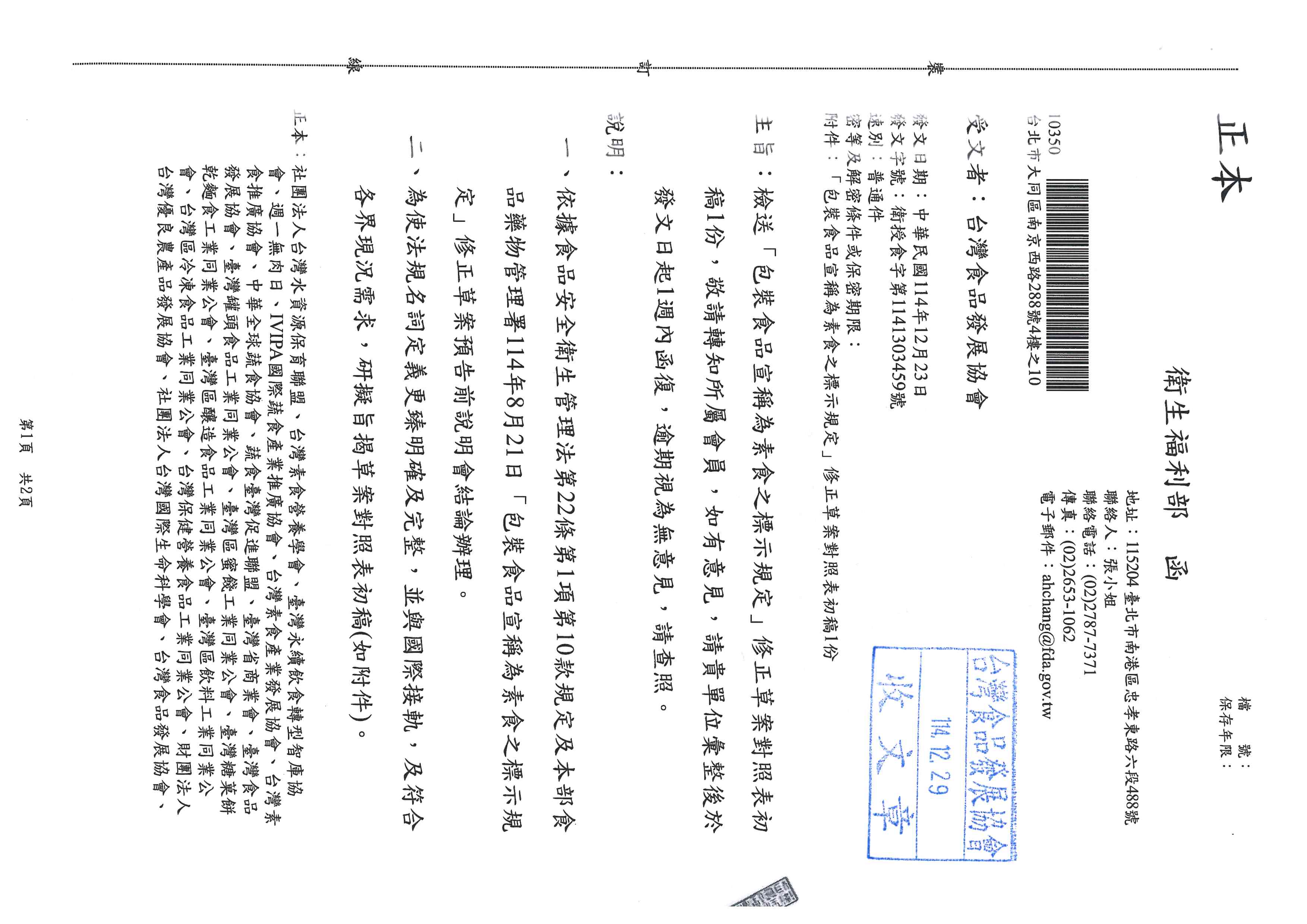 發佈日期:2025-12-29 檢送「包裝食品宣稱為素食之標示規定」修正草案對照表初稿1份,敬請轉知所屬會員,如有意見,請貴單位彙整後於發文日起1週內函復,逾期視為無意見,請查照。 檔案下載區 衛授食字第1141303459號 下載 回上一頁