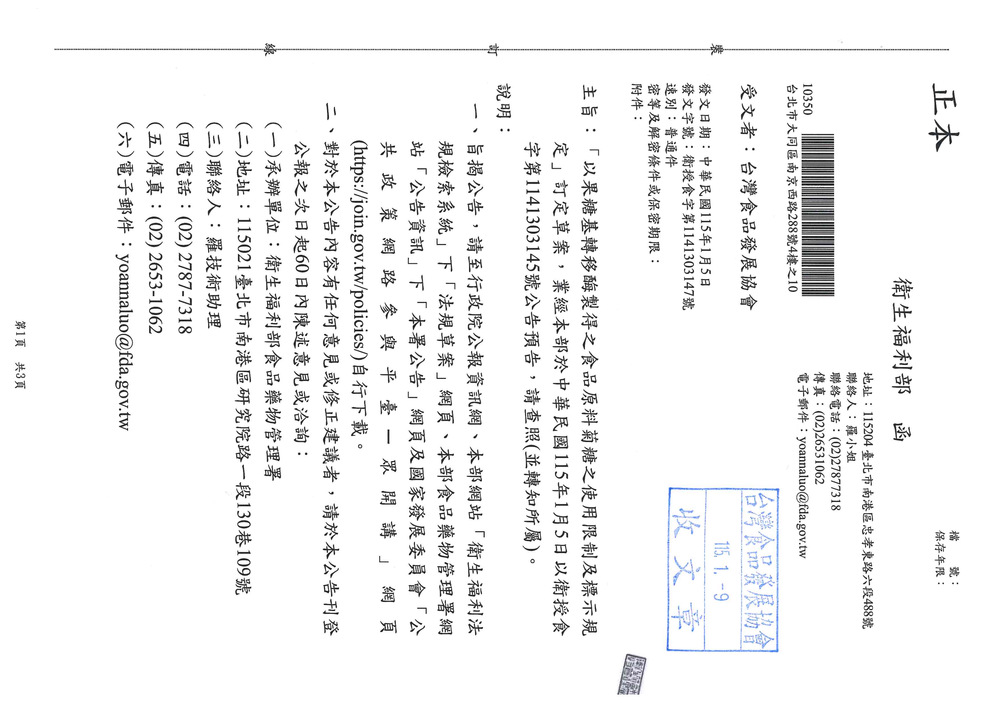 「以果糖基轉移酶製得之食品原料菊糖之使用限制及標示規定訂定草案,業經本部於中華民國115年1月5日以衛授食字第1141303145號公告預告,請查照(並轉知所屬)。