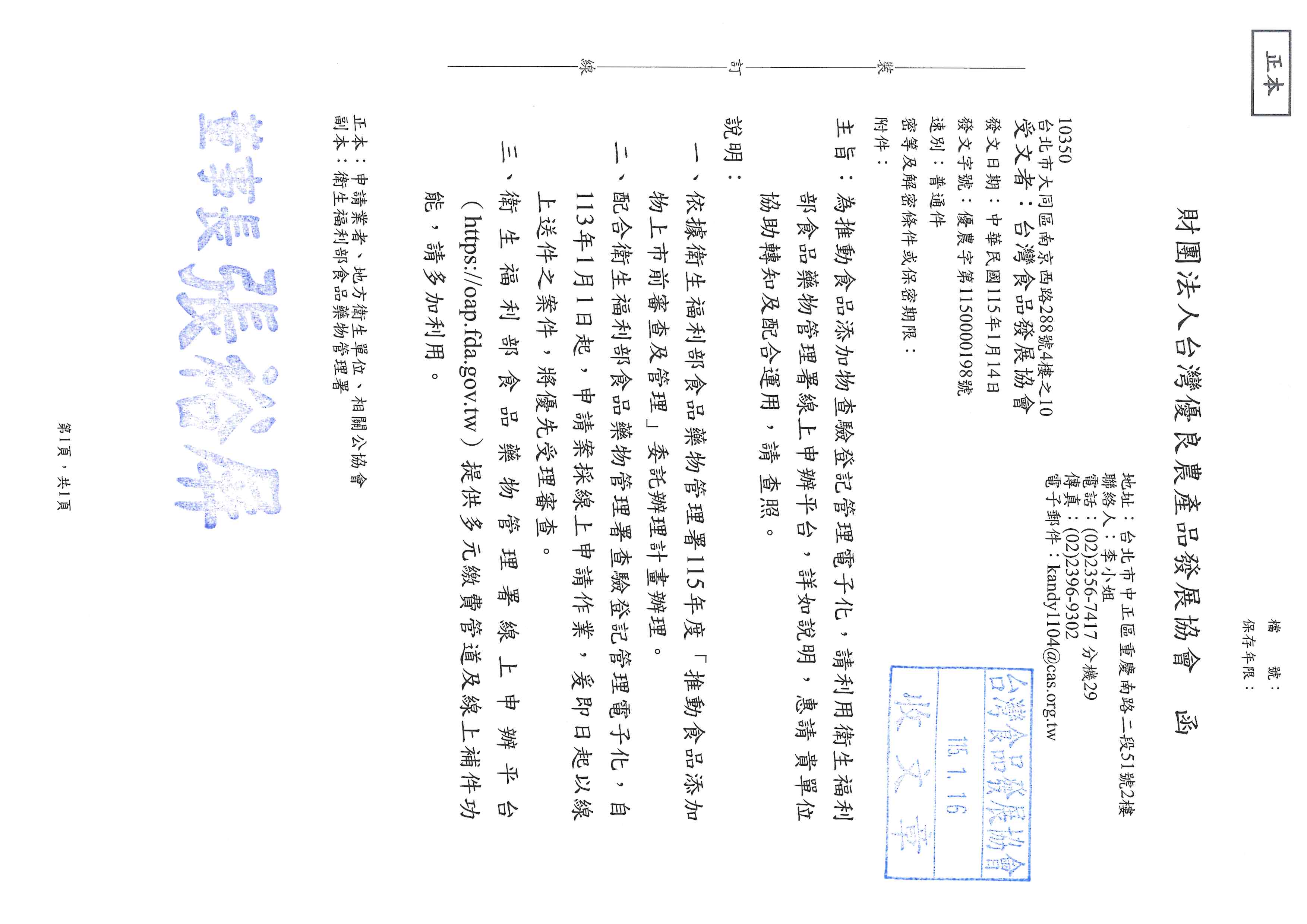 為推動食品添加物查驗登記管理電子化,請利用衛生福利部食品藥物管理署線上申辦平台,詳如說明,惠請 貴單位協助轉知及配合運用,請查照。