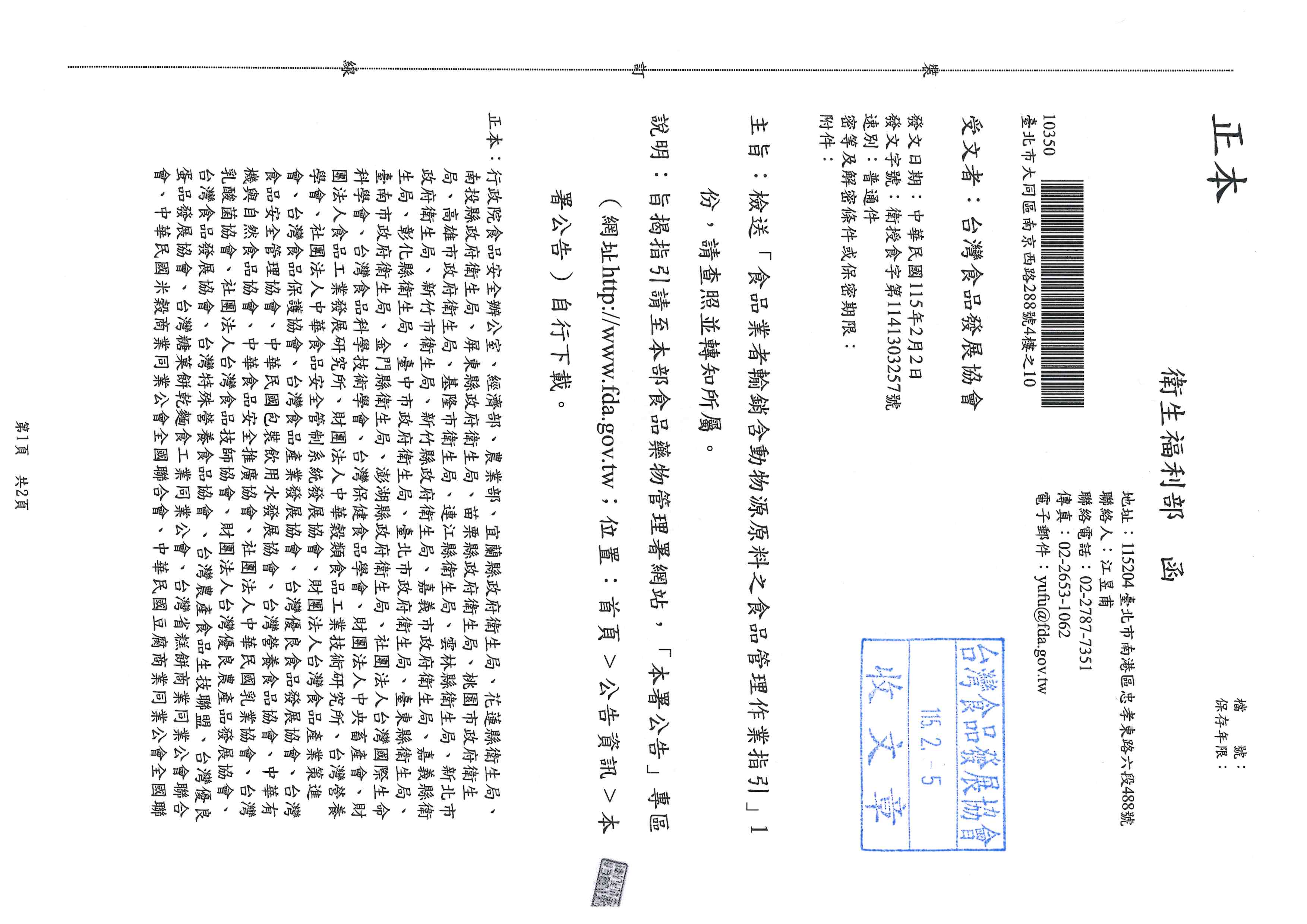 發佈日期:2026-02-05 檢送「食品業者輸銷含動物源原料之食品管理作業指引」1份,請查照並轉知所屬。 詳連結 及 提供附本供參閱 檔案下載區 食品業者輸銷含動物源原料之食品管理作業指引 下載 回上一頁