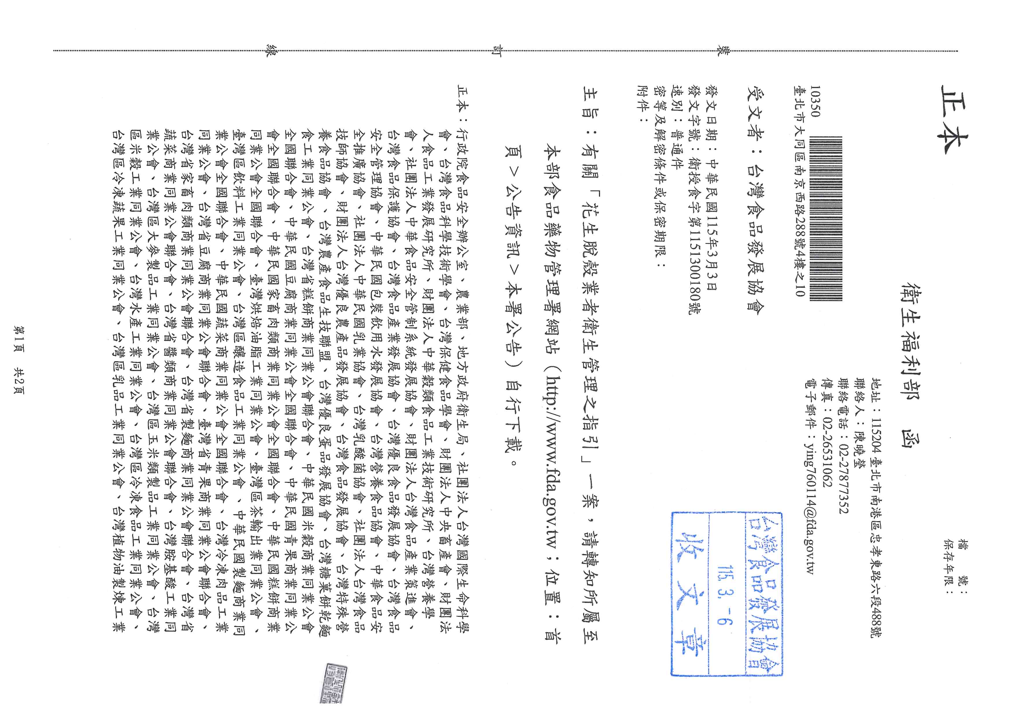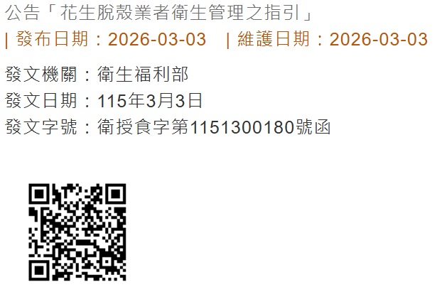 發佈日期:2026-03-06 有關「花生脫殼業者衛生管理之指引」一案,請轉知所屬至本部食品藥物管理署網站自行下載。 詳函文及連結QR Code即可下載。 檔案下載區 衛授食字第1151300180號 下載 回上一頁