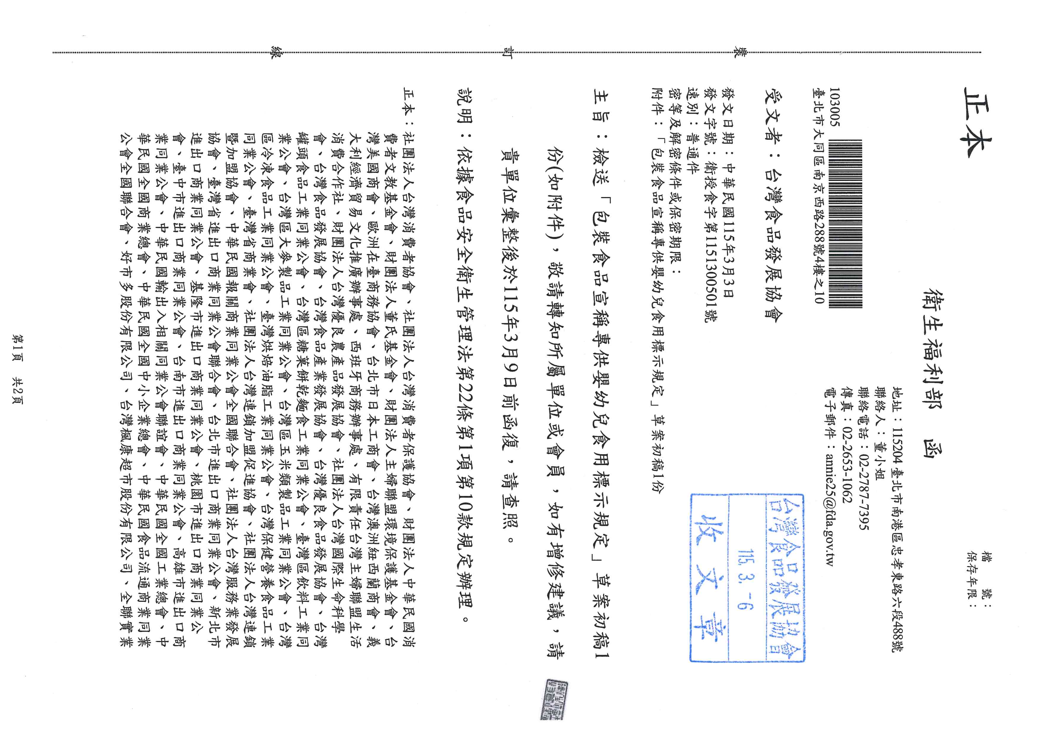 發佈日期:2026-03-06 檢送「包裝食品宣稱專供嬰幼兒食用標示規定」草案初稿1份(如附件),敬請轉知所屬單位或會員,如有增修建議,請 貴單位彙整後於115年3月9日前函復,請查照。 詳附件,若有增修建議,請3/9中午前提供 檔案下載區 衛授食字第1151300501號 下載 回上一頁