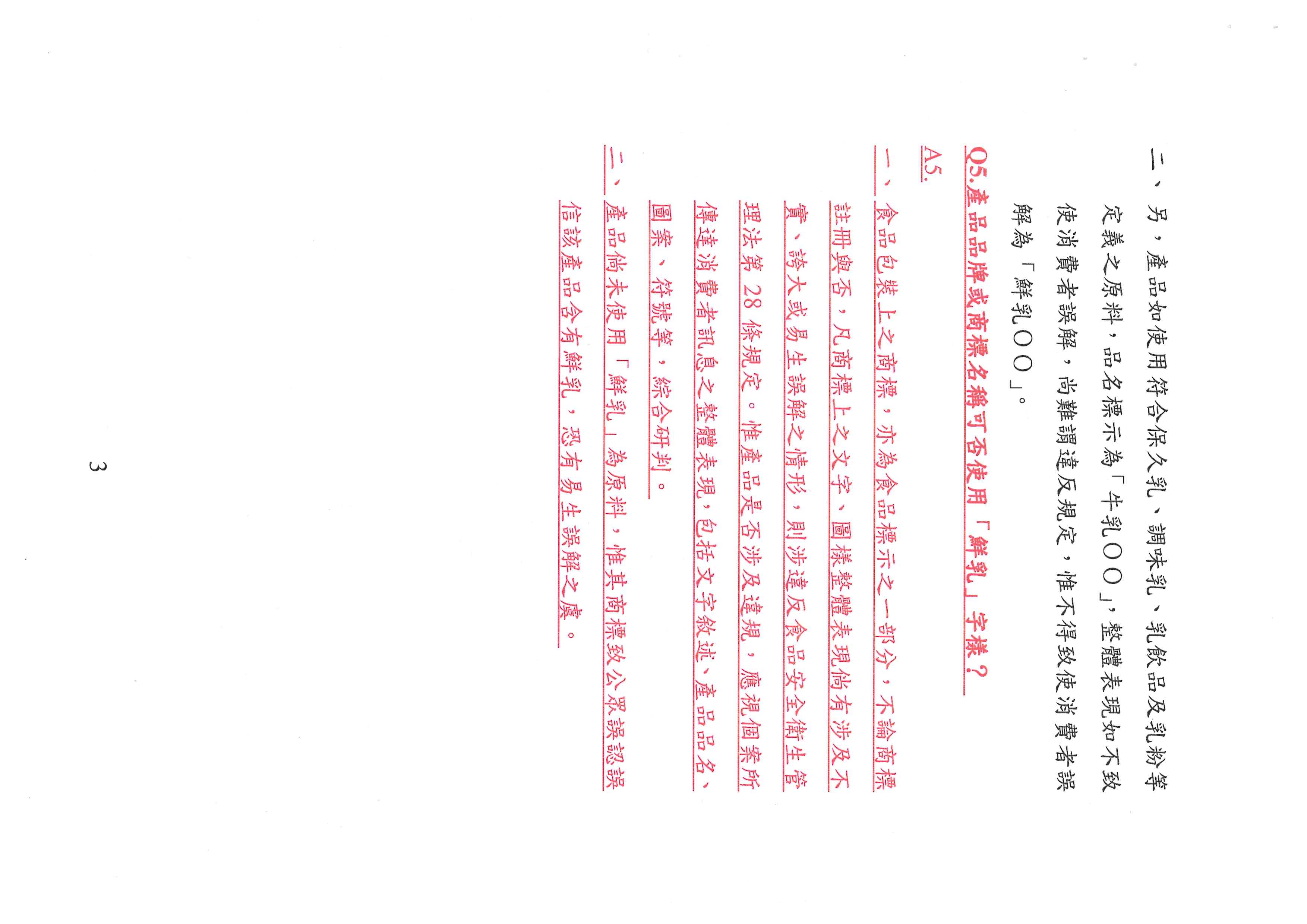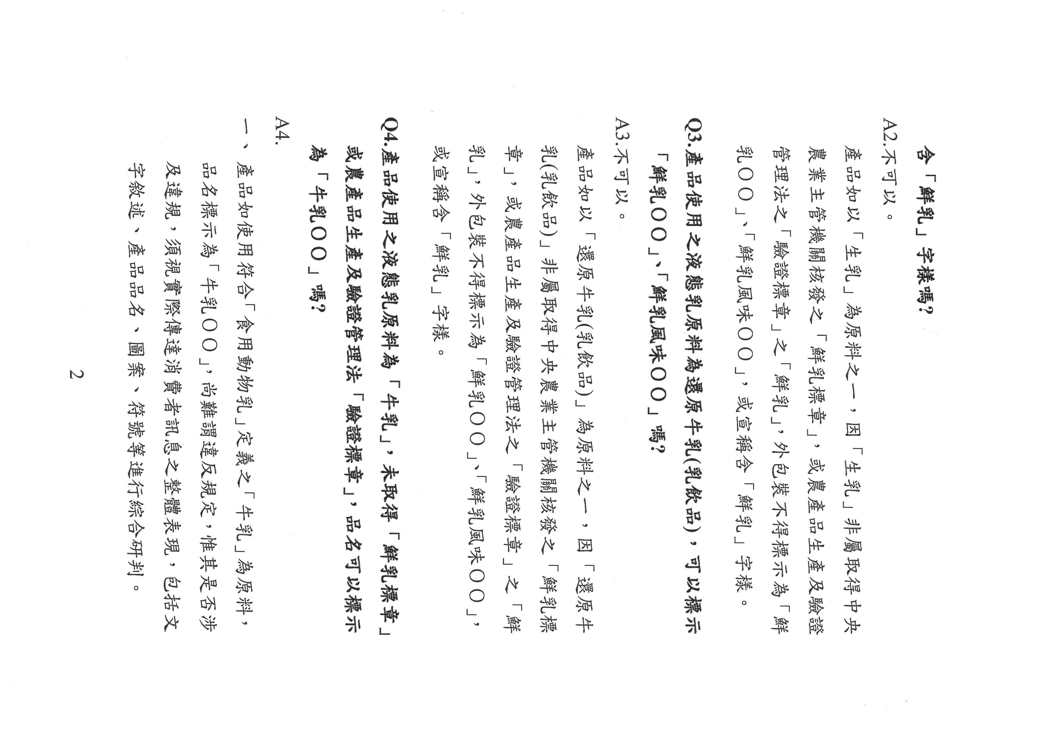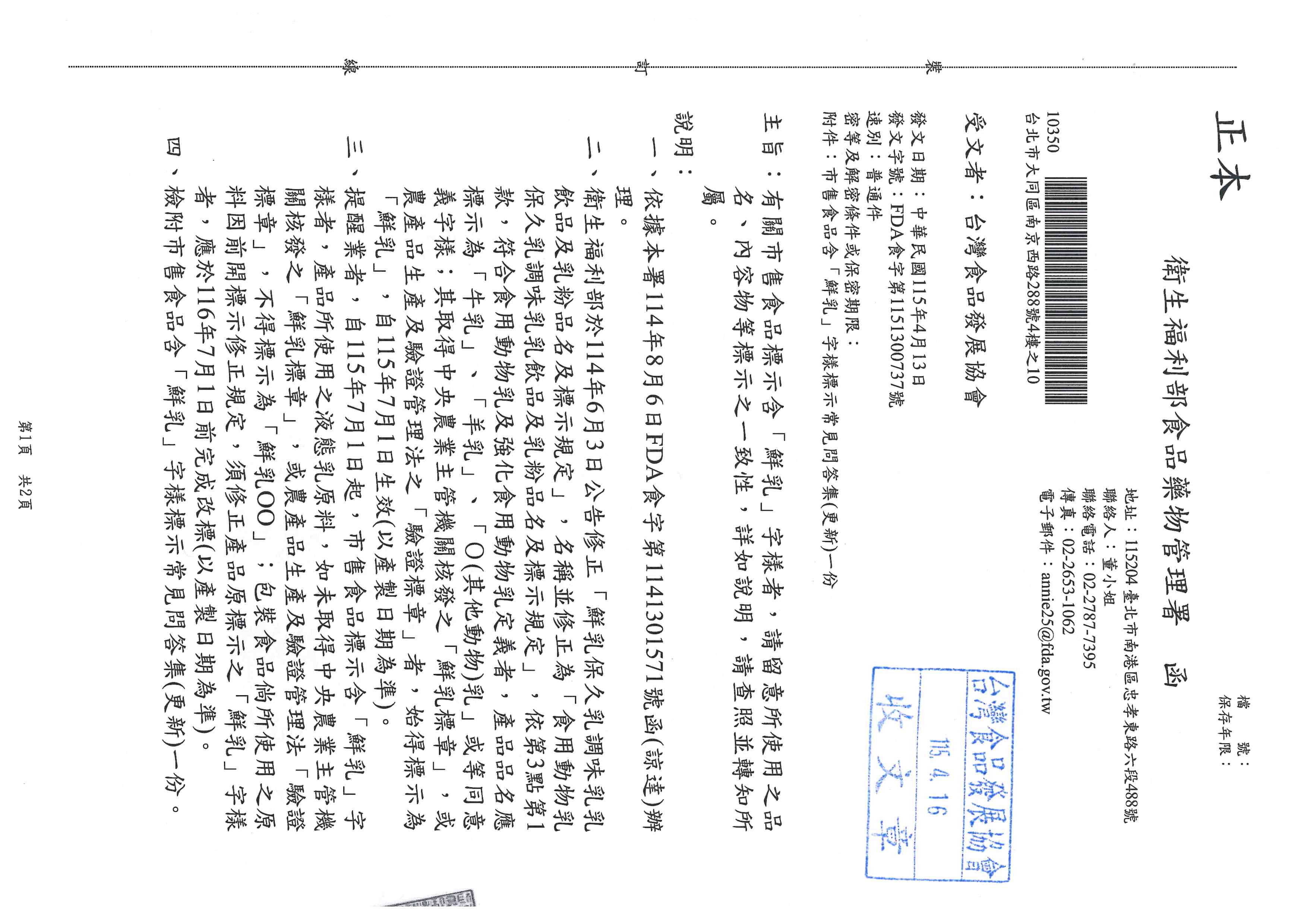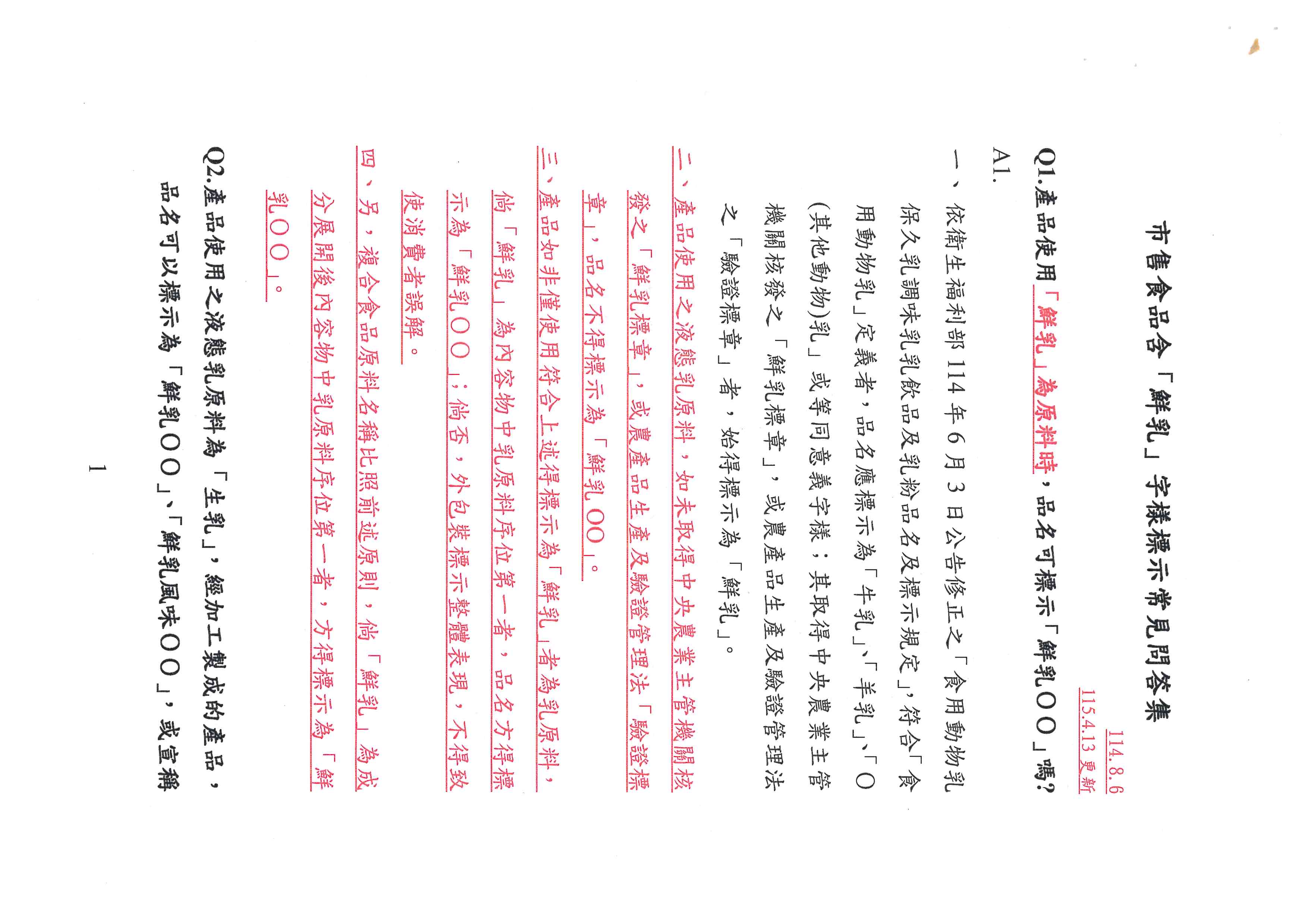 發佈日期:2026-04-16 有關市售食品標示含「鮮乳」字樣者,請留意所使用之品名、內容物等標示之一致性,詳如說明,請查照並轉知所屬。 詳函文及問答集 檔案下載區 FDA食字第1151300737號_問答集 下載 FDA食字第1151300737號 下載 回上一頁