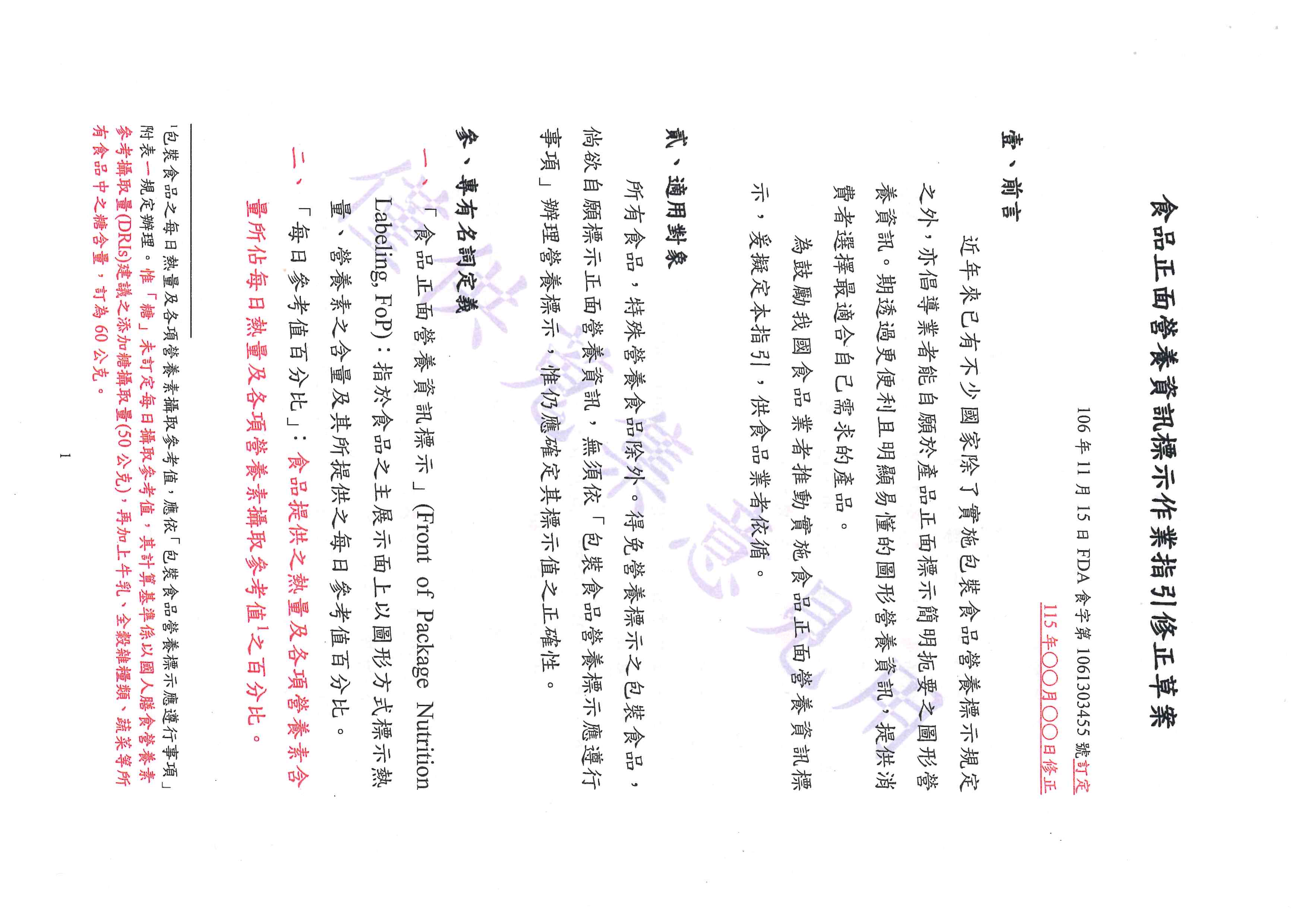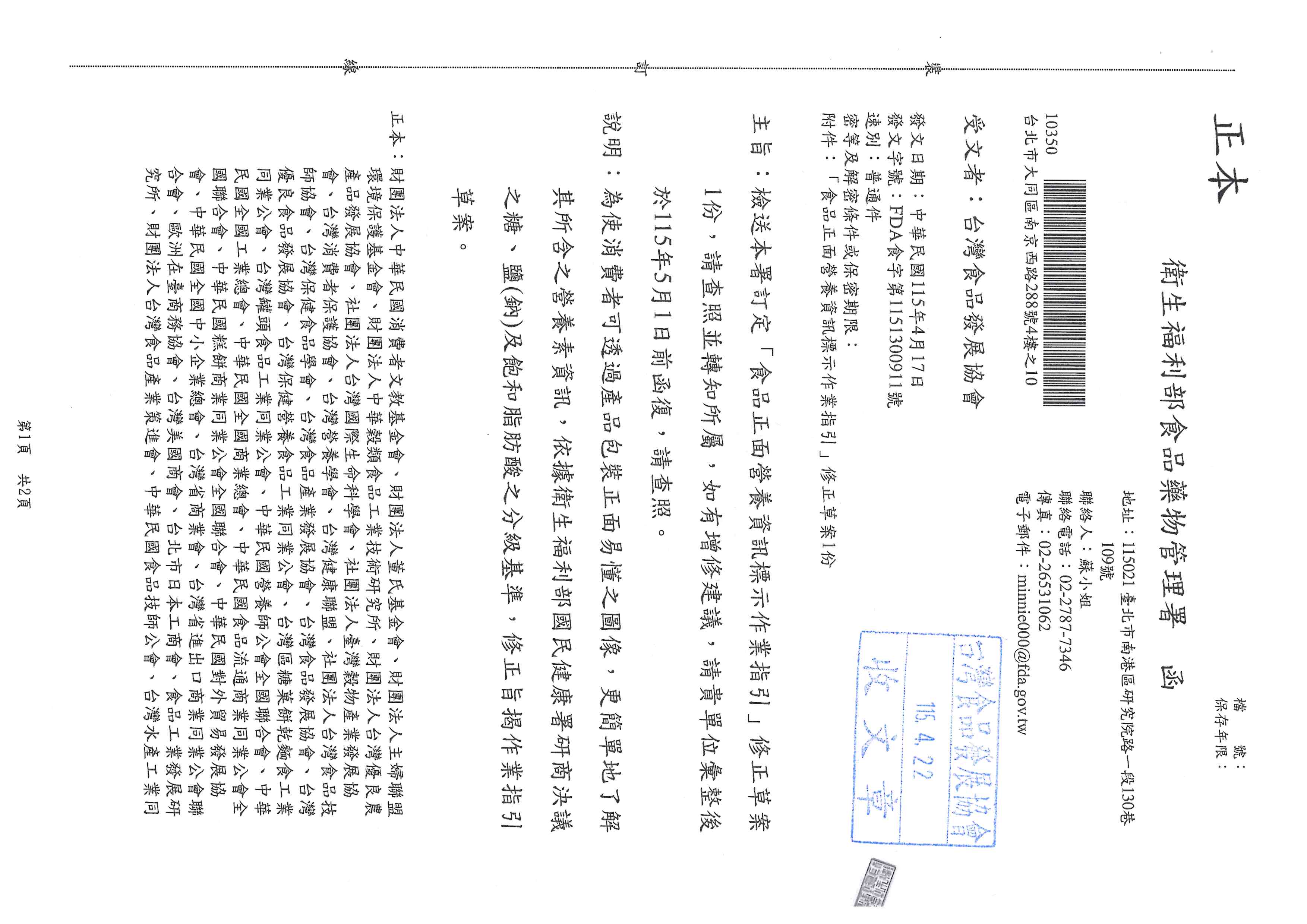 發佈日期:2026-04-22 檢送本署訂定「食品正面營養資訊標示作業指引」修正草案1份,請查照並轉知所屬,如有增修建議,請貴單位彙整後於115年5月1日前函復,請查照。 詳函文,若有增修建議,請於4/27下班前提供。 檔案下載區 FDA食字第1151300911號 下載 回上一頁