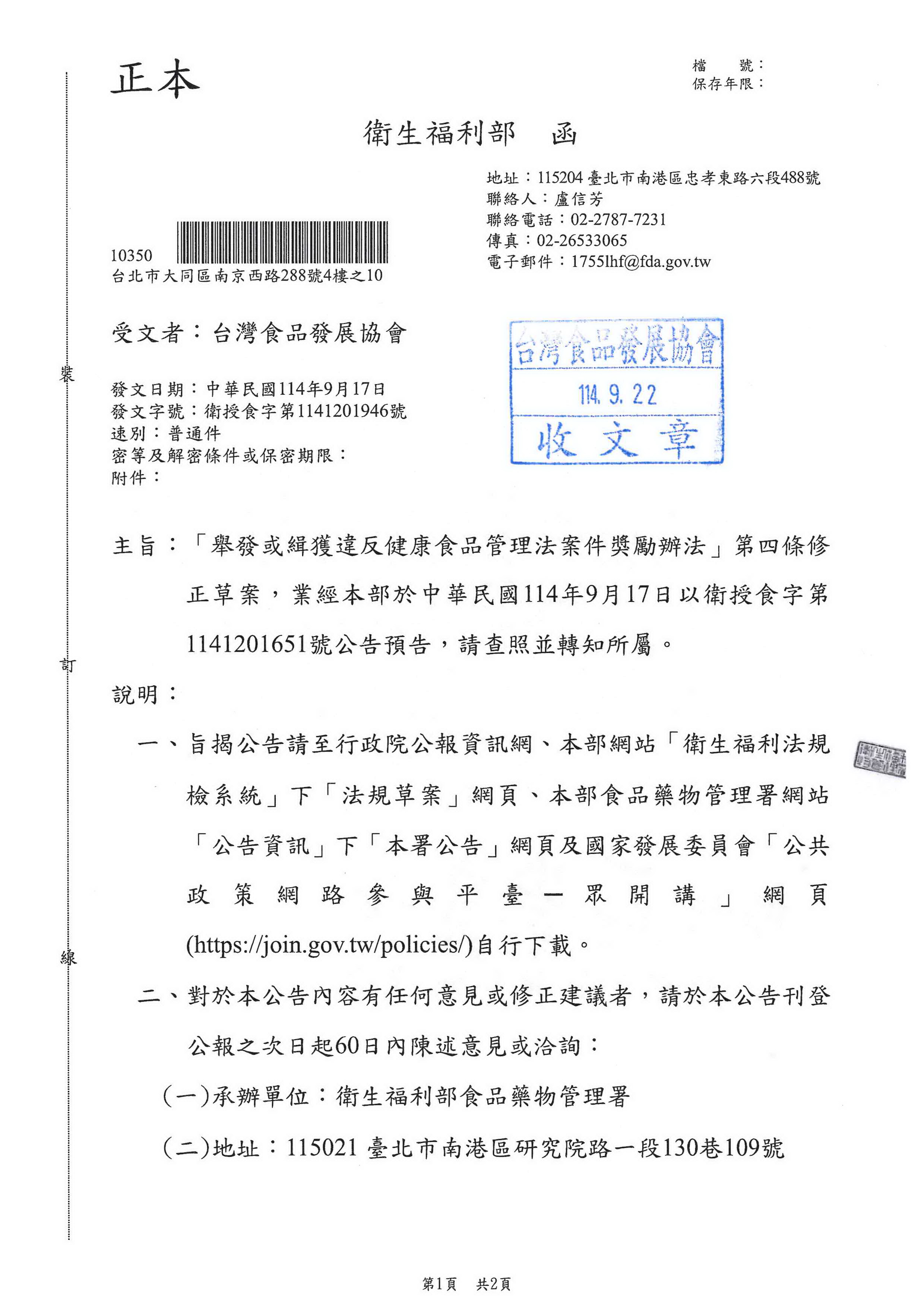 <舉發或緝獲違反健康食品管理法案件獎勵辦法>第四條修正草案,業經本部於中華民國114年9月17日以衛授食字第1141201651號公告預告,請查照並轉知所屬。