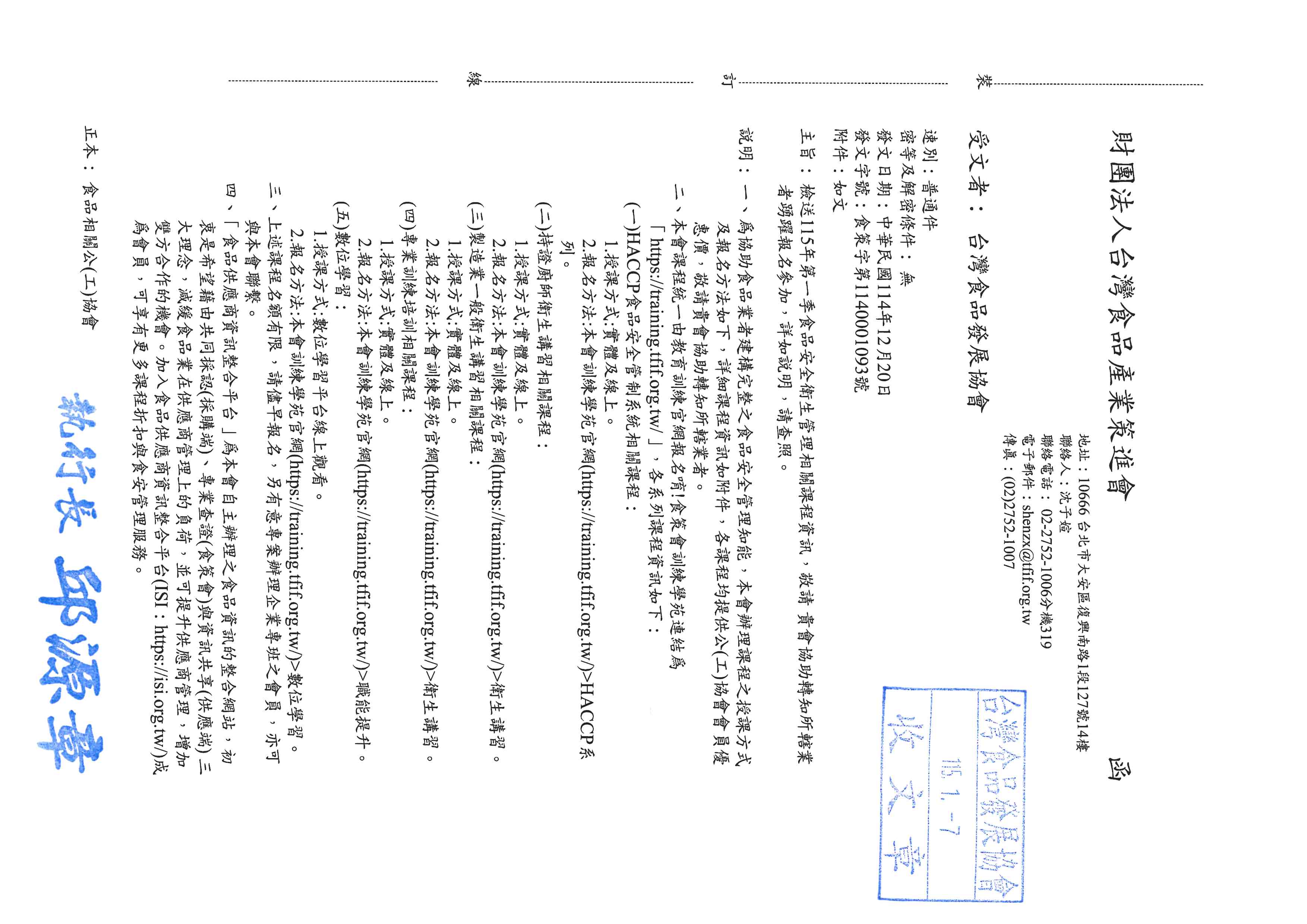 發佈日期:2026-01-07 檢送115年第一季食品安全衛生管理相關課程資訊,敬請 貴會協助轉知所轄業者踴躍報名參加,詳如說明,請查照。 詳附件及連結課程食策會訓練學苑|專屬食品人的必備知識 : 課程列表 回上一頁