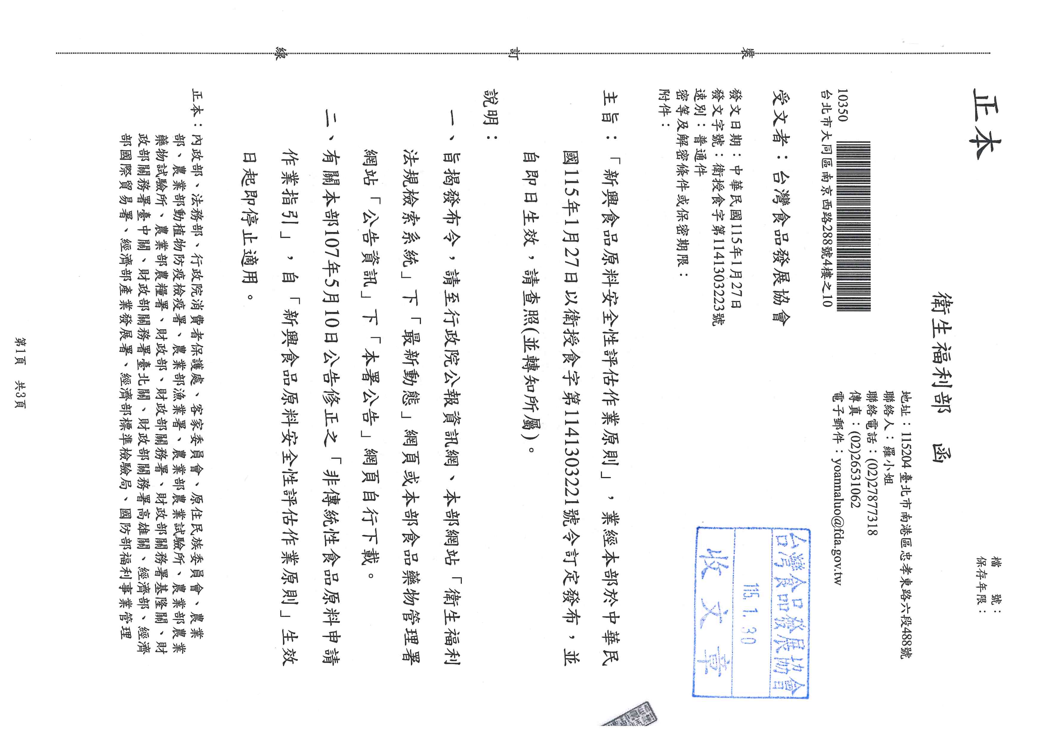 發佈日期:2026-01-30 「新興食品原料安全性評估作業原則」,業經本部於中華民國115年1月27日以衛授食字第1141303221號令訂定發布,並自即日生效,請查照(並轉知所屬) 詳下圖函文,「新興食品原料安全性評估作業原則」如附檔或參閱 連結 檔案下載區 新興食品原料安全性評估作業原則 下載 衛授食字第1141303223號 下載 回上一頁