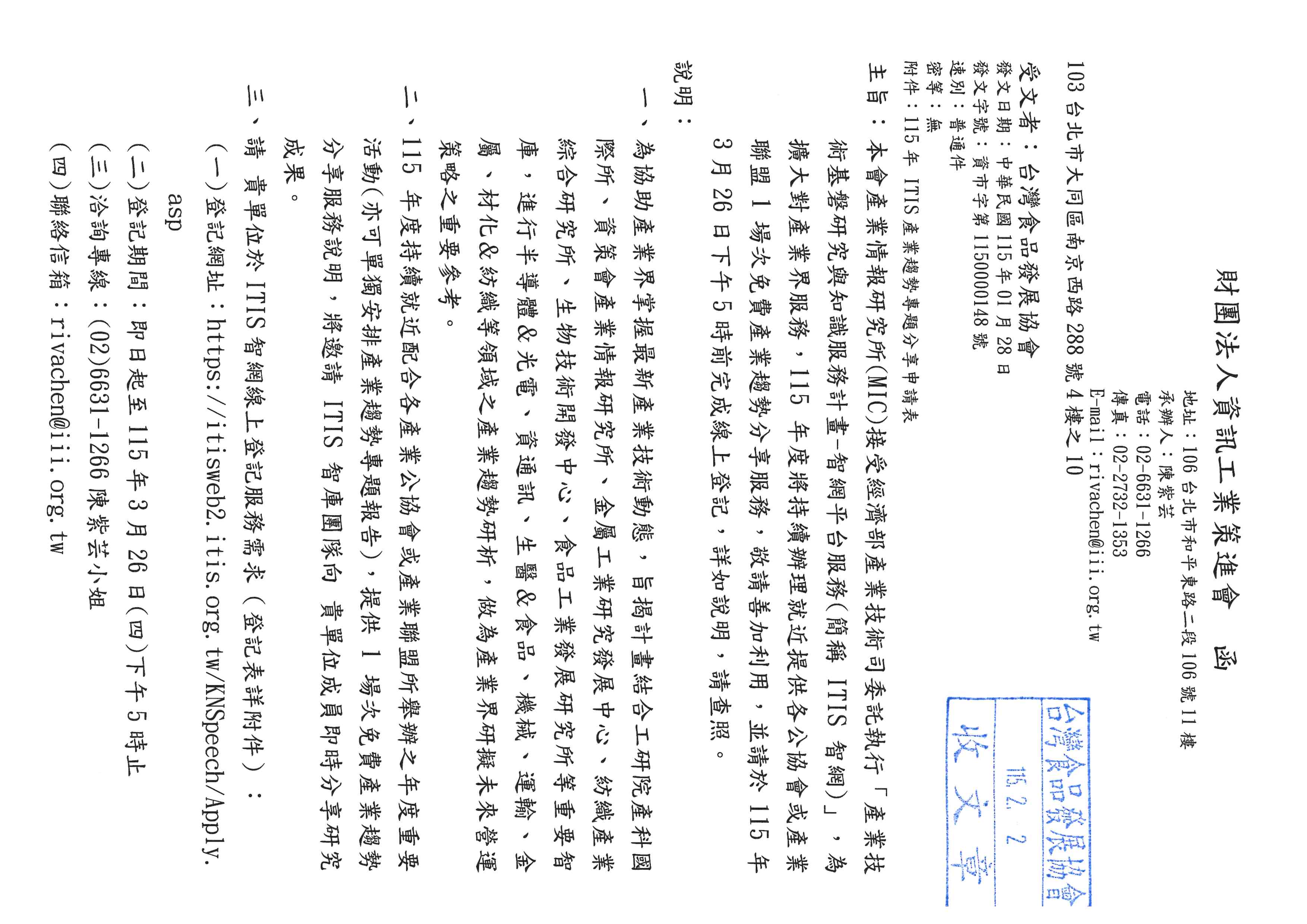 本會產業情報研究所(MIC)接受經濟部產業技術司委託執行「產業技術基磐研究與知識服務計畫-智網平台服務(簡稱 ITIS 智網)」,為擴大對產業界服務,115年度將持續辦理就近提供各公協會或產業聯盟1場次免費產業趨勢分享服務,敬請善加利用,並請於115年3月26日下午5時前完成線上登記,詳如說明,請查照。