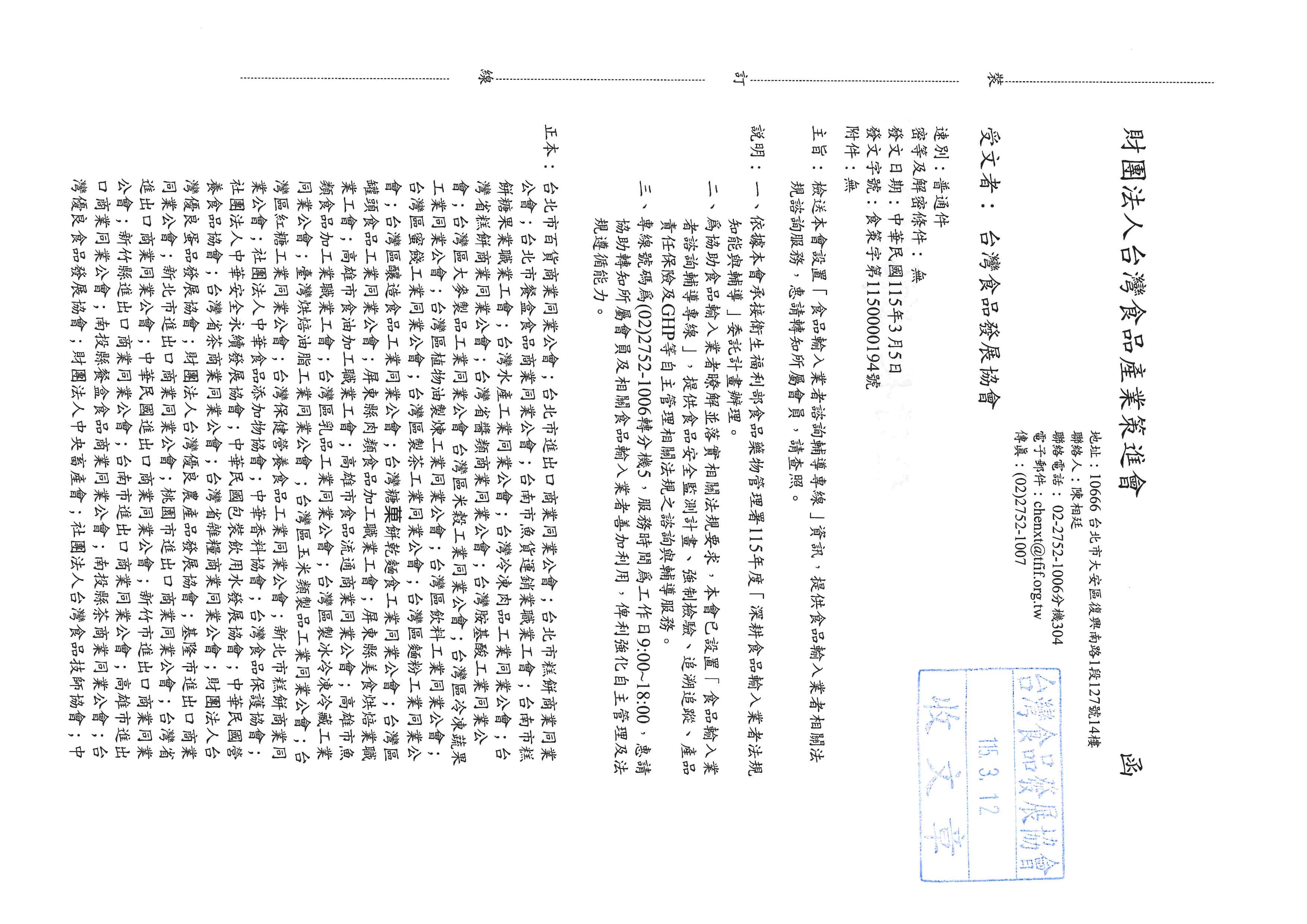 發佈日期:2026-03-12 檢送本會設置「食品輸入業者諮詢輔導專線」資訊,提供食品輸入業者相關法規諮詢服務,惠請轉知所屬會員,請查照。 詳附件說明 檔案下載區 食策字第1150000194號 下載 回上一頁