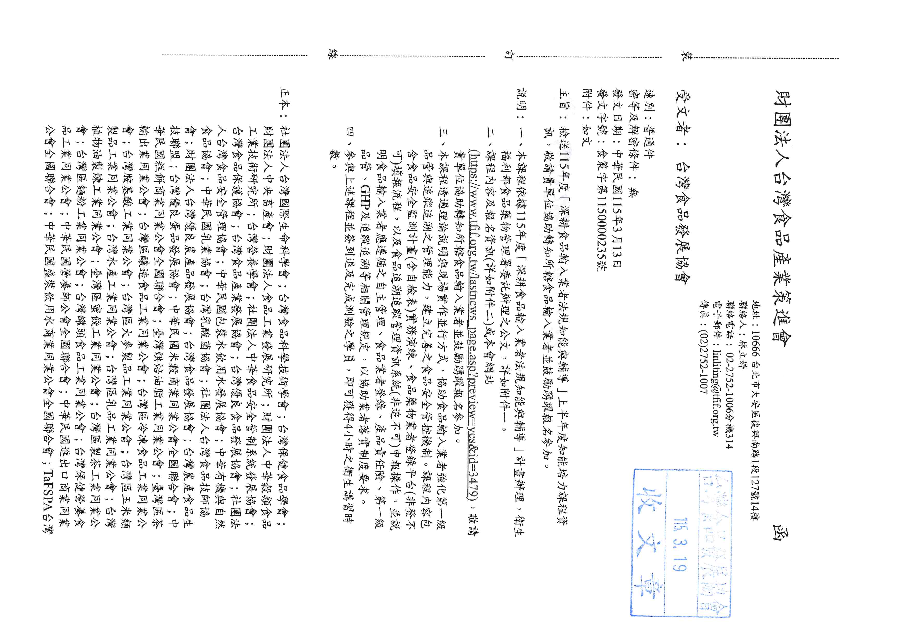 發佈日期:2026-03-19 檢送115年度「深耕食品輸入業者法規知能與輔導」上半年度知能培力課程資訊,敬請貴單位協助轉知所轄食品輸入業者並鼓勵踴躍報名參加。 詳附件及參考<連結報名課程> 檔案下載區 食策字第1150000235號_附件一 下載 食策字第1150000235號_附件二 下載 食策字第1150000235號 下載 回上一頁