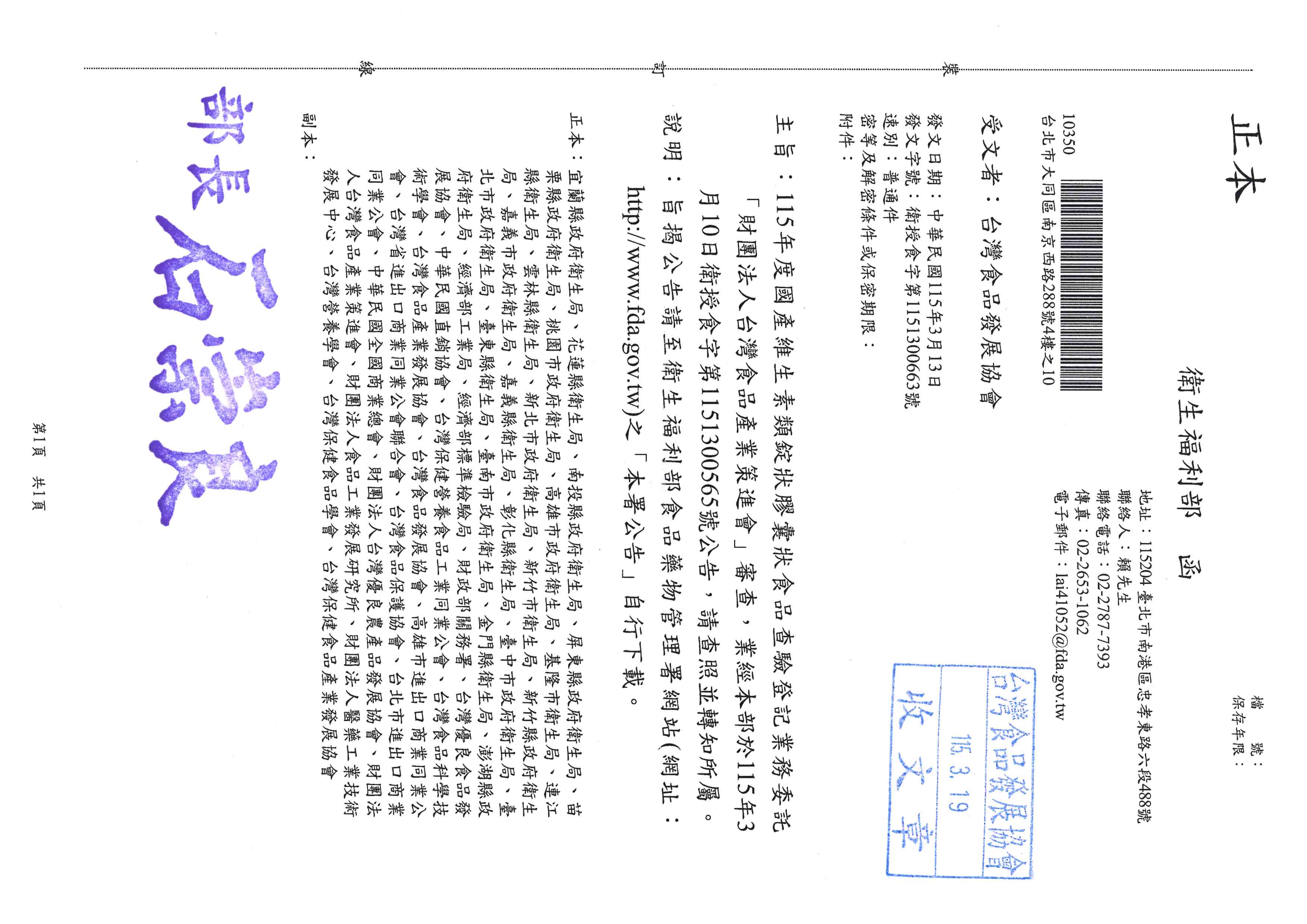 發佈日期:2026-03-19 115年度國產維生素類錠狀膠囊狀食品查驗登記業務委託「財團法人台灣食品產業策進會」審查,業經本部於115年3月10日衛授食字第115300565號公告,請查照並轉知所屬。 詳函文及附件,也可掃描下列QR Code 檔案下載區 衛授食字第1151300663號 下載 回上一頁