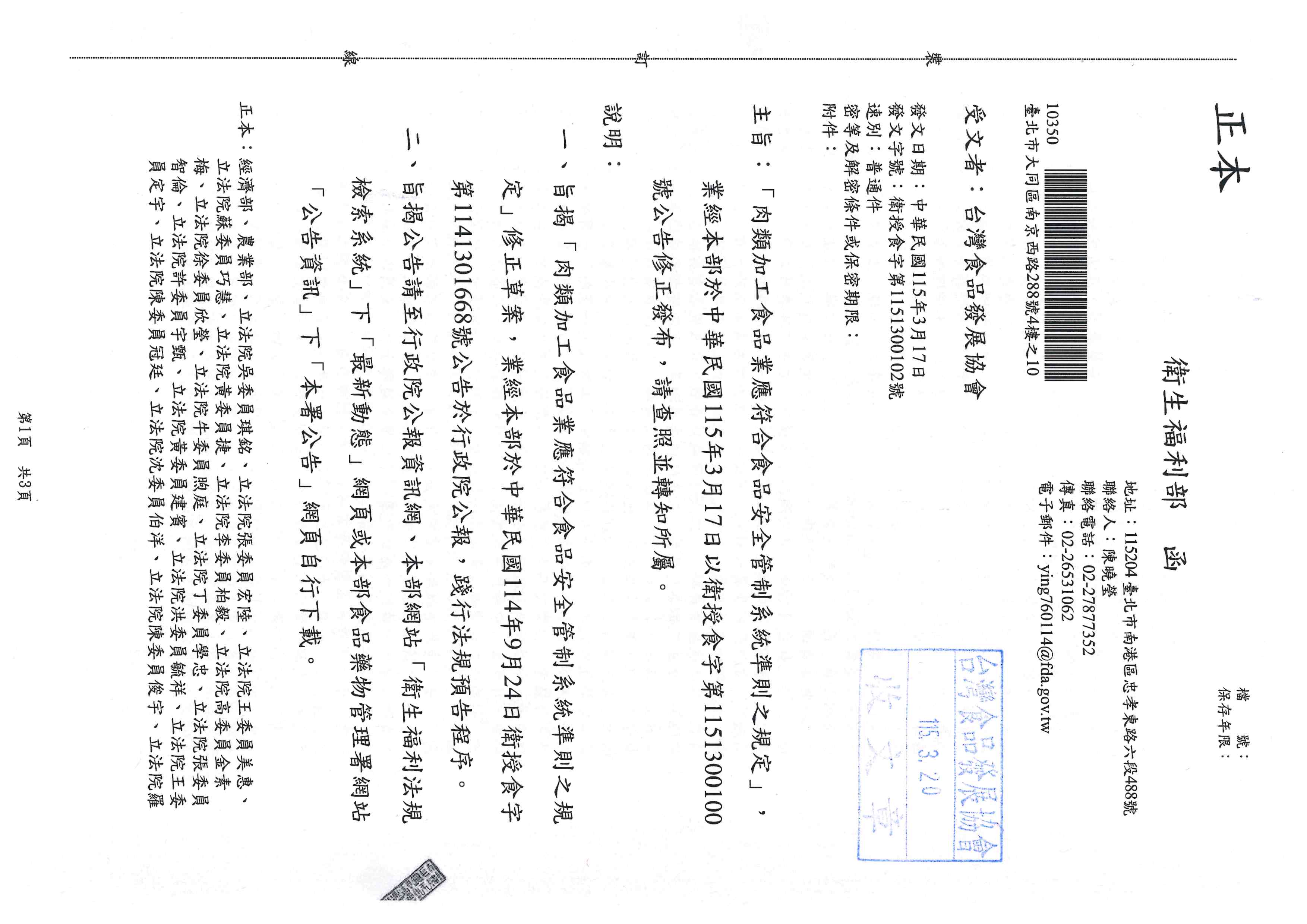 發佈日期:2026-03-20 「肉類加工食品業應符合食品安全管制系統準則之規定」,業經本部於中華民國115年3月17日以衛授食字第1151300100號公告修正發布,請查照並轉知所屬。 詳函文或掃描連結下載。 檔案下載區 衛授食字第1151300102號 下載 回上一頁