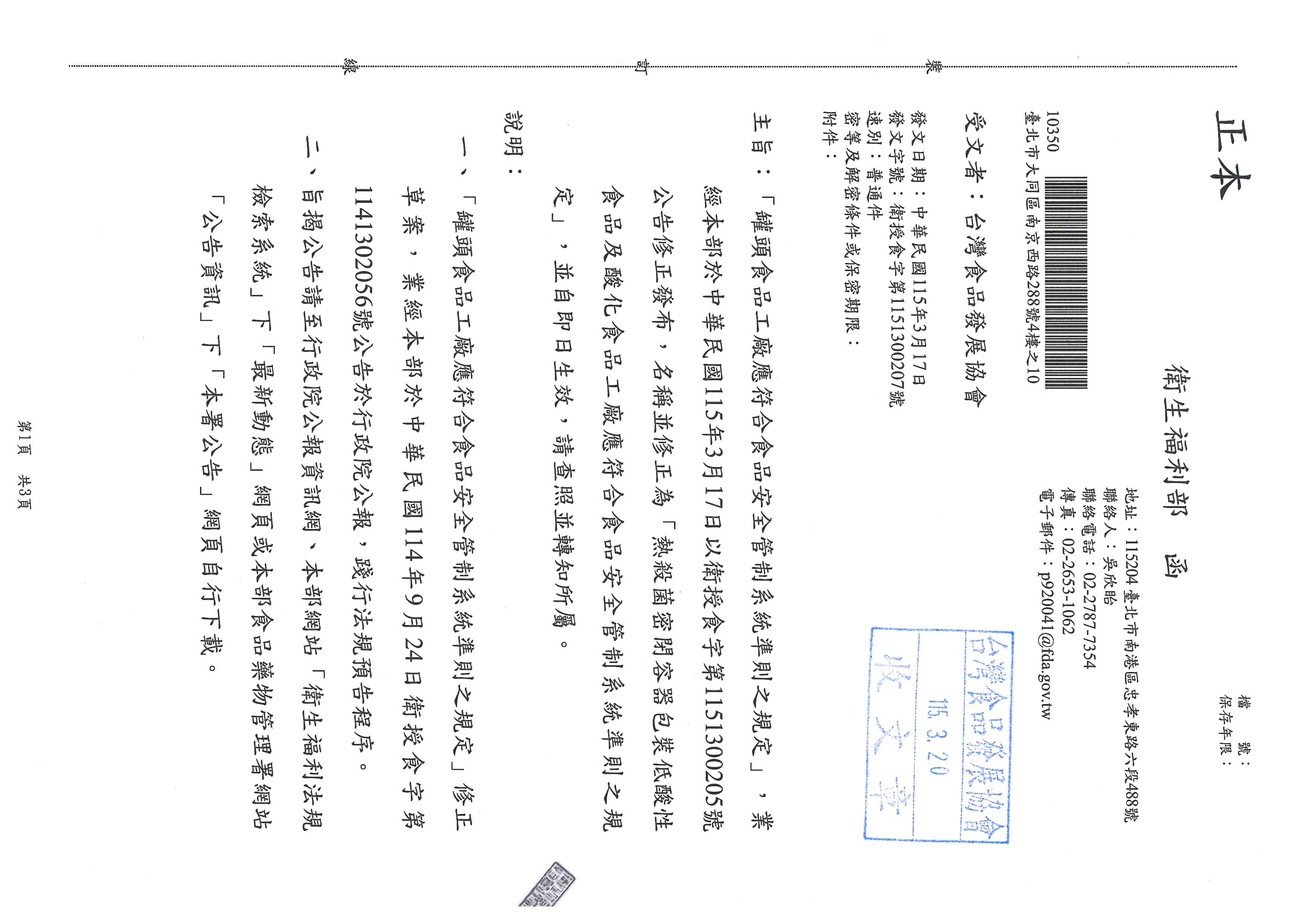 發佈日期:2026-03-20 「罐頭食品工廠應符合食品安全管制系統準則之規定」,業經本部於中華民國115年3月17日以衛授食字第1151300205號公告修正發布,名稱並修正為「熱殺菌密閉容器包裝低酸性食品及酸化食品工廠應符合食品安全管制系統準則之規定」,並自即日生效,請查照並轉知所屬。 詳函文或掃描連結下載 檔案下載區 衛授食字第1151300207號 下載 回上一頁